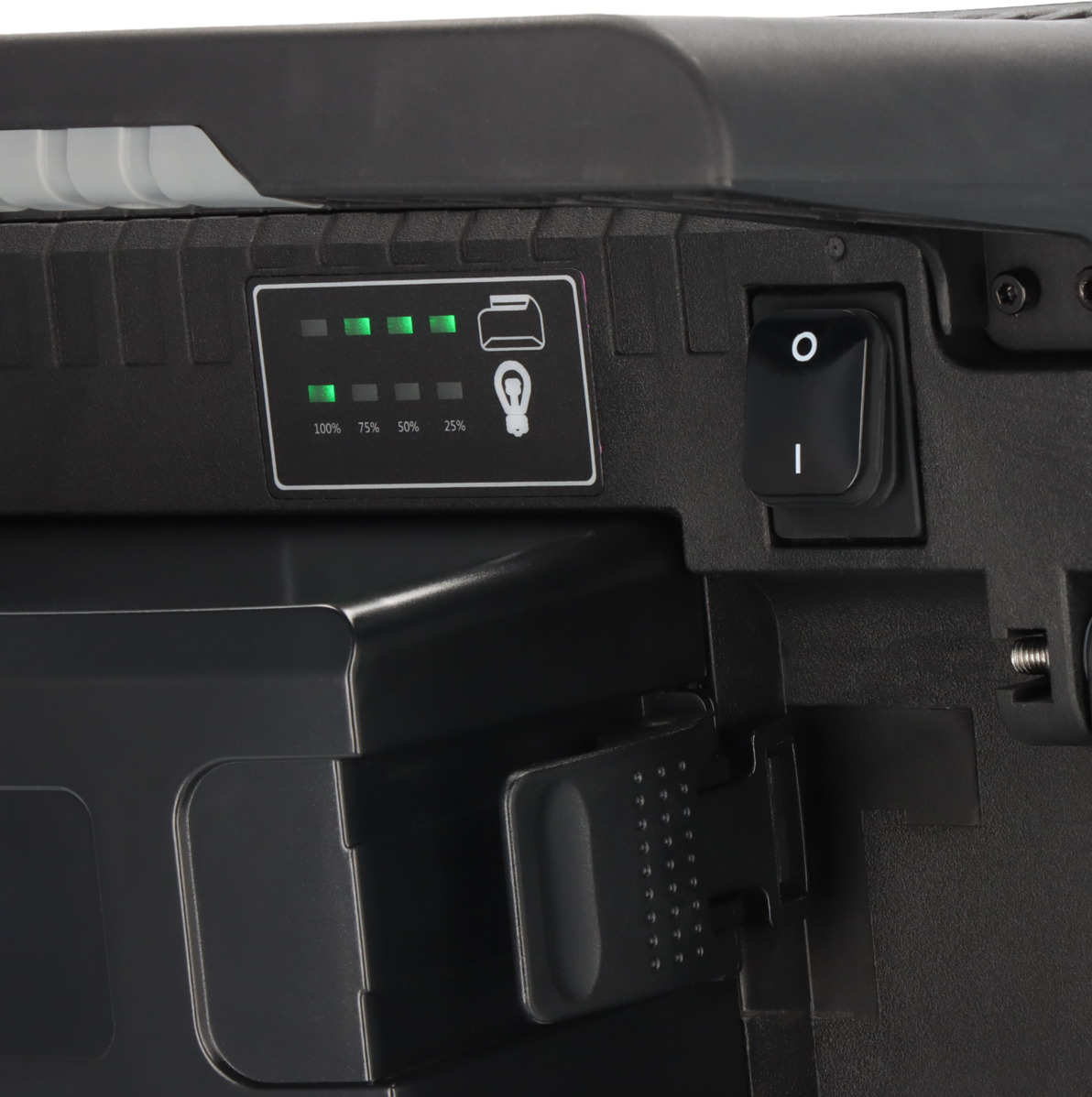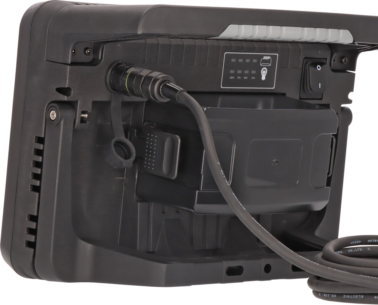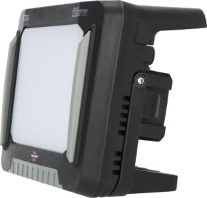 Baustellenstrahler mit 4 Schaltstufen (100% – 75% – 50% – 25%) und Schutzsystem für Power-Tool Akkus: vor Tiefenentladung, Überhitzung (hervorgerufen durch hohe Lastströme) und Batteriefehler geschützt