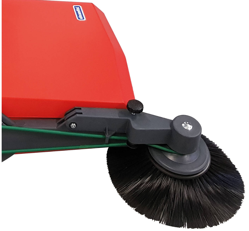 Ohne Lärm und Emission kann sie mit Leichtigkeit bedient werden. Der Stossbügel kann zur ergonomischen Anpassung umgedreht werden. Seitenbesen und Hauptkehrwalze verstellbar. Gebaut für den harten Einsatz.